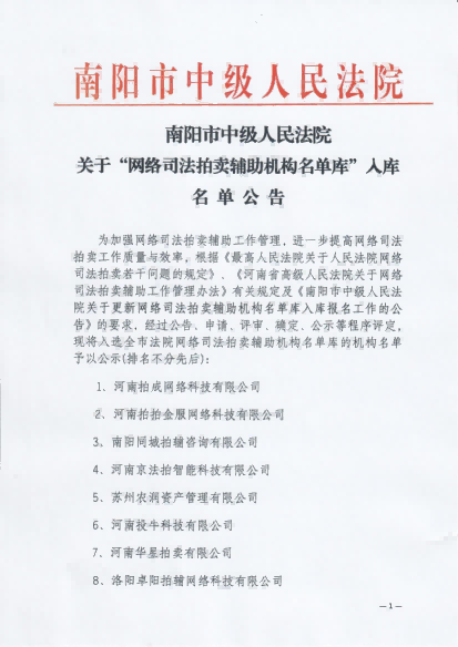 2025年1月入圍南陽市中級法院“網(wǎng)絡(luò)司法拍賣輔助機構(gòu)名單庫”